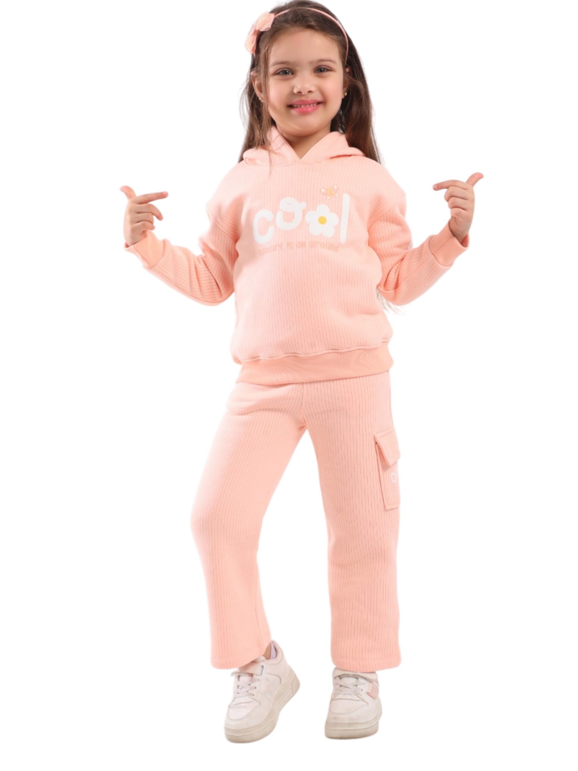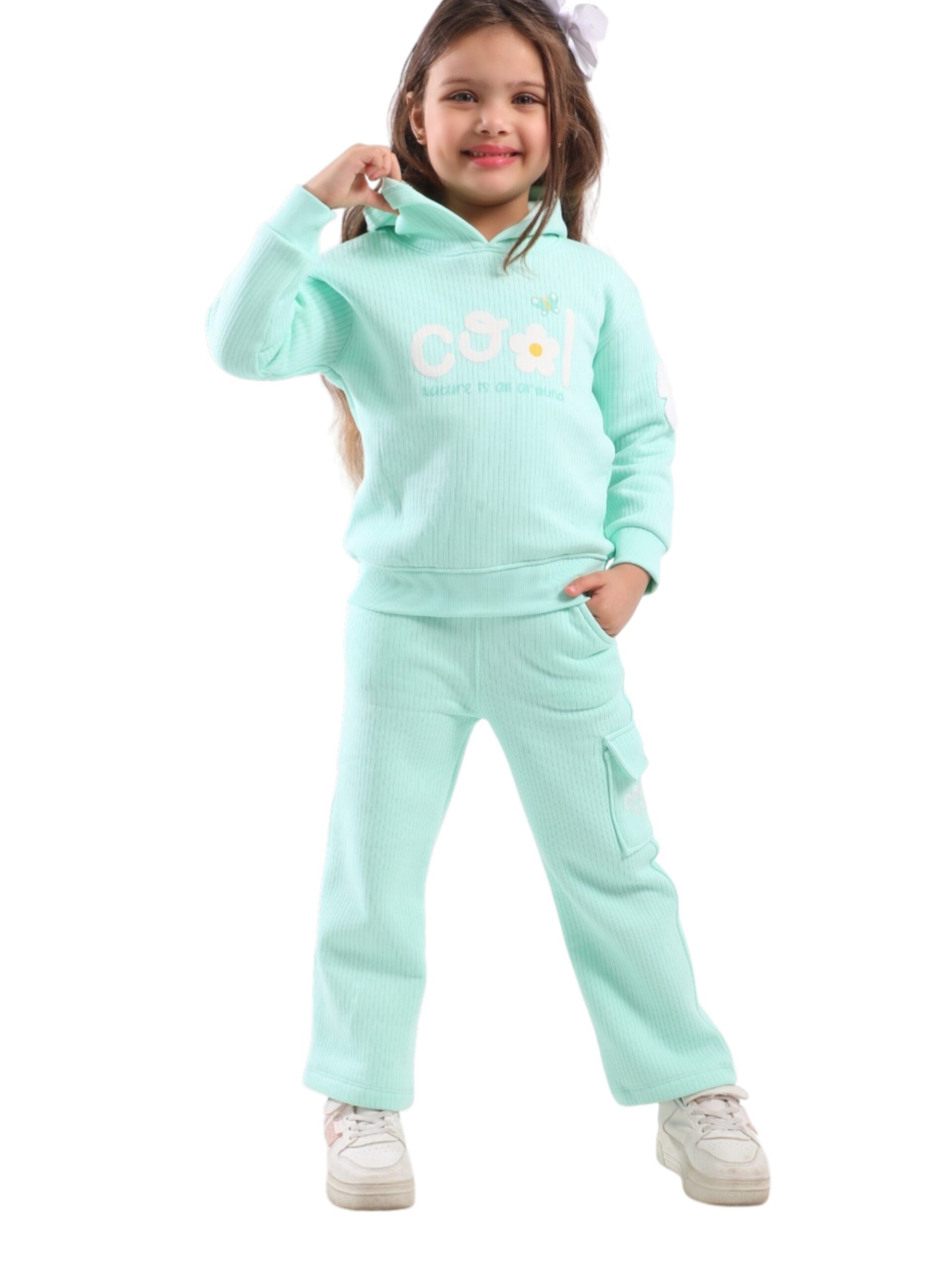 Comfortable and stylish 2 piece girls trung set with cabochon, perfect for girls aged 2-5 years. This coordinating set features a modern design and attractive colors for active kids. The top is a cabochon hoodie with a fun print, while the roomy and comfortable pant allows for freedom of movement and play. Made from soft fabric that provides all-day comfort. The ribbed construction adds a distinctive feel and a modern look. The pants have handy side pockets for keeping small items. This set is perfect for everyday wear, whether at home or going out, and can be easily paired with sneakers. Available in multiple colors including mint green and peach pink. Gives your child a fashionable and comfortable look at the same time.